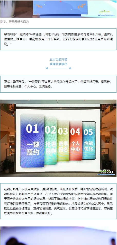 运动达人、视频博主梁鸿喜欢跑步和健身,平时会去健身房锻炼核心力量,以前只能通过其他平台查询场馆,还要打电话与商家沟通确认,经常到了健身房发现白跑一趟。“现在有了一键预约平台,只需要轻轻一点,就能查询场馆使用情况,能做到心中有数了。”梁鸿说。