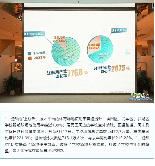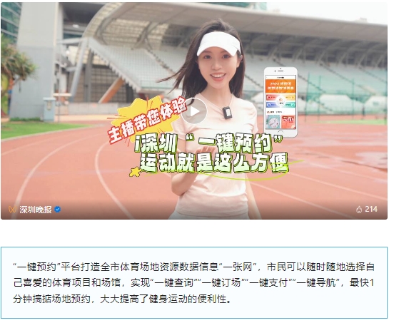 针对健身需求旺盛与运动场地供给不足的问题、“爱运动的人找不到场地”与“体育场馆使用率不高”的矛盾,深圳创新构建“一网统管、一键预约”体育场馆预约平台,接入“i深圳”。预约平台2021年9月试运营,2022年6月18日正式上线。市民可便捷、高效地实现场馆预订、费用支付以及在线导航等操作,为推进超大型城市体育场馆错时共享新模式,进行了有益的探索。