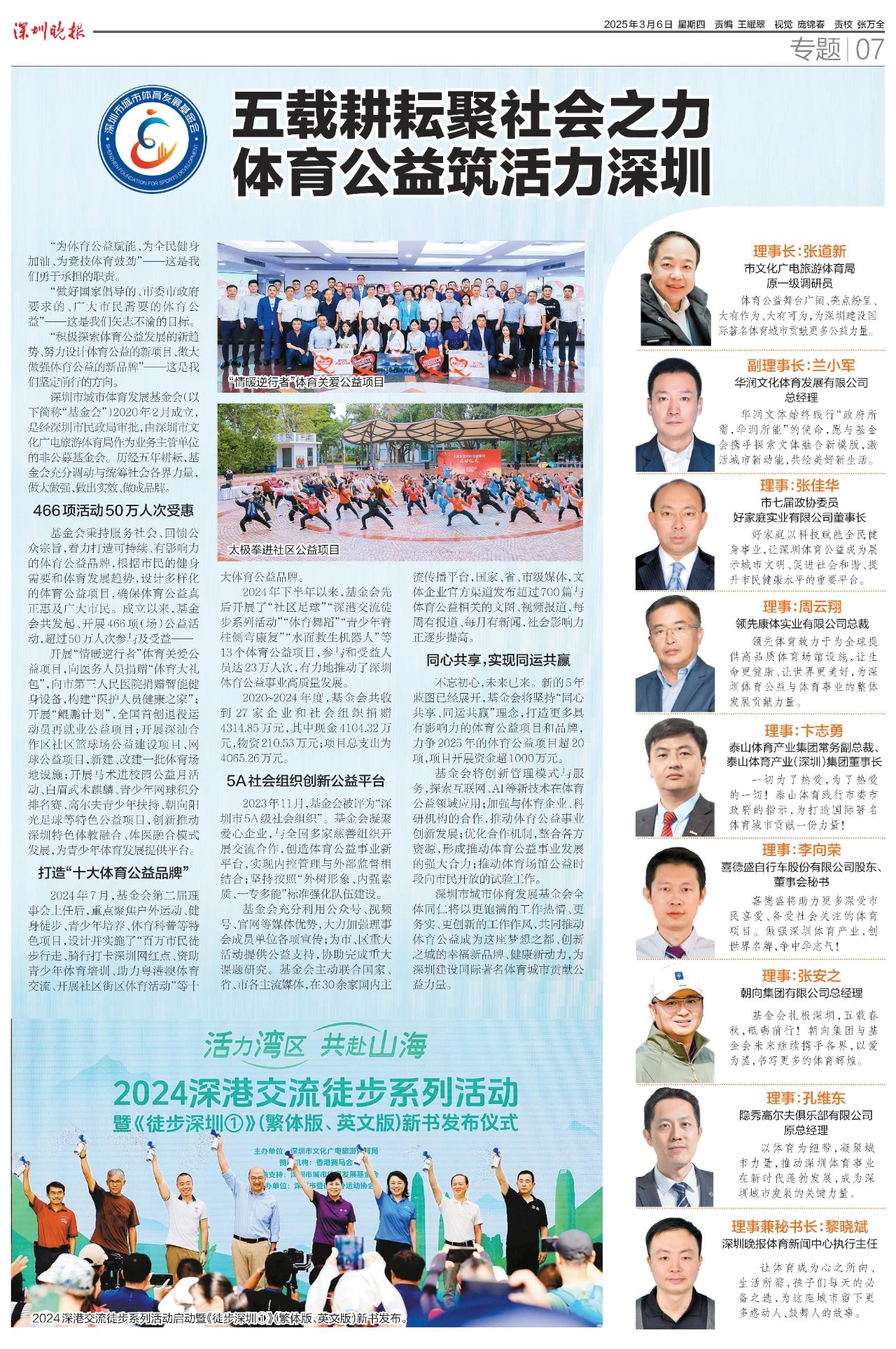 深圳市城市体育发展基金会是由市财政注资、市民政局审批、市文化广电旅游体育局主管,获评“深圳市5A级社会组织”。 3月6日,庆祝本会成立五周年之际,推出《五载耕耘聚社会之力 体育公益筑活力深圳》专版,记录我会始终充分调动与统筹社会各界力量,做大做强、做出实效、做成品牌,秉持服务社会、回馈公众宗旨,共发起、开展466项(场)公益活动,超过50万人次参与及受益。 下一个五年,我会将着力打造可持续、有影响力的体育公益品牌,根据市民的健身需要和体育发展趋势,设计多样化的体育公益项目,确保体育公益真正惠及广大市民;以更饱满的工作热情、更务实、更创新的工作作风,共同推动体育公益成为这座梦想之都、创新之城的幸福新品牌、健康新动力,为深圳建设国际著名体育城市贡献公益力量。 3月6日,我会于深圳隐秀高尔夫俱乐部召开第二届理事会第五次会议。全体理事、监事参会,围绕公益资源整合等重点内容,部署年度工作。法定代表人张道新述职指出,2024年我会对接30余家单位,推动13项公益项目落地,惠及23万人次,募集703.32万元资金并合理运用。同时,建立全流程监管体系,开展培训提升团队能力,通过央媒、公众号宣传提升品牌影响力。 展望2025年,我会以 “科技赋能、生态共建” 为驱动,规划超20项公益项目,投入超千万打造品牌,将试点 AI 健身平台、开放场馆公益时段、实现区级分会全覆盖,还将强化党建与人才机制建设。与会人员积极建言,未来我会将立足深圳辐射湾区,以公益推动城市发展,为社会进步注入体育动力。 1月13日,“2025年青少年脊柱侧弯康复公益项目启动仪式” 在深圳广电集团举行。该项目由我会发起,在市文化广电旅游体育局指导下,由深圳广电集团体育健康频道承办,市体育产业协会予以支持。 项目资金源于2023年11月举办的“深圳市首届体育公益专场拍卖会”,善款于12月捐赠至我会用于此项目。2024年12月起,我会资助多个康复站(点)定时开展筛查、治疗等服务并举办讲座、培训;资助深圳体育健康频道制作直播与科普节目。 2025年1月24日12时,2024深圳市 “十大体育赛事活动” 评选网络投票启动。该评选由市文化广电旅游体育局主办,市城市体育发展基金会公益支持,市体育产业协会承办。涵盖 “十大高水平”、“十大群众、“十大特色”体育赛事三大类别,60项候选赛事经严格筛选,涉及传统与新兴项目,尽显深圳体育赛事多元。 2024年,深圳举办超200场重大体育赛事,覆盖竞技与群众体育,吸引顶尖选手与游客,拉动赛事经济。此次评选旨在总结成就,助力体育赛事品牌建设,推动深圳迈向国际著名体育城市。 3月22日,持续四个多月、历经192场比赛的2024-2025深圳农商银行铁狼本地杯社区足球赛收官。松岗足协队决赛点球胜南岭村队卫冕,壆岗队获季军。赛事吸引深圳九区48支社区队、近千球员参赛,覆盖123个社区,彰显社区足球水平与全民健身活力。 颁奖环节,各奖项名花有主,松岗足协队揽下多项荣誉。比赛期间,深圳农商银行联合本会开展公益活动,870粒进球转化为公益值助力青少年体育。场外非遗展、闭幕式精彩节目,丰富赛事体验。此次赛事为社区足球爱好者搭建平台,注入活力,本会也将继续助力深圳体育建设 。 展现风采、汇聚力量——企业风采采撷 3月10日,本会理事长张道新走访环球文旅,与环球文旅集团总裁李良英、粤港澳大湾区商业联合会总会主席朱新兰等座谈,了解环球文旅情况,并就合作开展白斌极限跑公益行动进行深入讨论。 环球文旅执行总裁蔡昕介绍项目进展,海南墨子慈善基金会会长周少凯分享公益举措,呼吁体育人士投身公益、期望两地文旅联动。张道新赞扬白斌精神,表示本会将整合资源助力深圳体育公益。双方达成多项合作共识,欲将白斌极限跑公益行动打造成深圳体育文化符号,本会后续将依托公益,为深圳体育建设出力 。 3月20日,我会理事长张道新率队到中国杯帆船赛组委会调研。中国杯帆船赛组委会副秘书长钟勇等,与本会围绕体育旅游产业发展展开讨论。钟勇提出创新理念并介绍赛事成果、大鹏新区规划,张道新分享本会成果与发展思路。双方达成合作意向,将携手优化中国杯帆船赛志愿服务。此次交流搭建沟通桥梁,未来将整合资源推动产业发展,助力深圳体育文化事业。 跨界融合,资源共享——行业交流采撷 3月10日,福田区政协专职常委陈葵与市帆船帆板运动协会秘书长黄仪绍到访我会,就合作推广青少年帆船运动、推动帆船运动大众化、开展城市体育文化建设等展开交流。 陈葵称深圳发展水面运动潜力大,推动帆船运动可丰富健身形式、培养人才、提升赛事影响力,期望与我会合作优化设施、推广青少年帆船运动。黄仪绍指出帆船运动正从小众走向大众。双方围绕公益助力帆船普及、建设国际体育名城探讨,张道新表示本会将探索新模式推动帆船大众化。此次交流为合作奠定基础,后续我会将助力帆船融入市民生活 。 规范管理,创新发展——项目开展采撷 2025年第一季度,在张道新理事长主持下,我会秘书处共召开18次工作例会,重点研究了理事会会议召开、项目引流、项目开展落地等工作事项。 第一季度我会开展和支持包括2025年青少年脊柱侧弯康复、深圳社区足球、优瞳运动场改造、“黔动青春“体育公益等多项体育公益项目。截至3月31日,2025年度